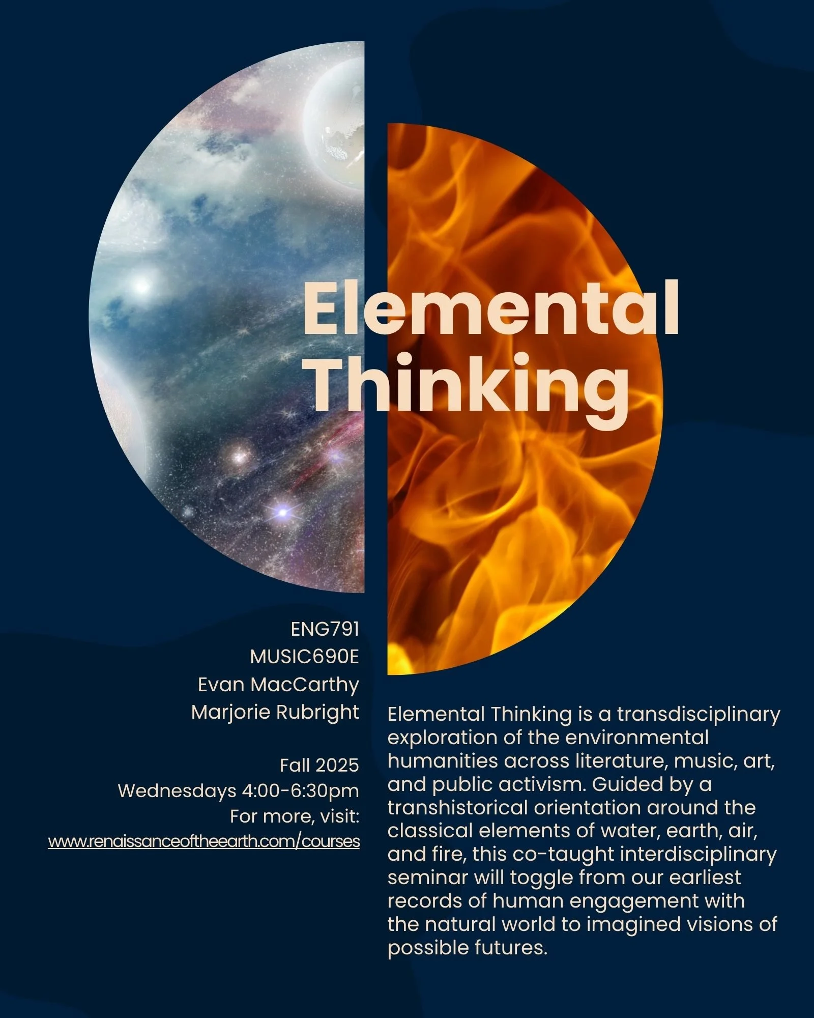 This seminar stages a “collision laboratory” between literatures of the earth produced by Renaissance writers (1450 – 1750) and current popular, artistic, literary and scientific writings about the Anthropocene. It has two aims: first, to explore how seemingly current conversations regarding environmental disaster, sustainability, and resilience traffic in ideas, metaphors, and modes of thinking whose roots extend into the Renaissance; and, second, to consider how early modern habits of thought and practice might not only resemble the present but influence it, aiding in our challenge of imagining alternative forms of habitation and cultivation of the earth.
