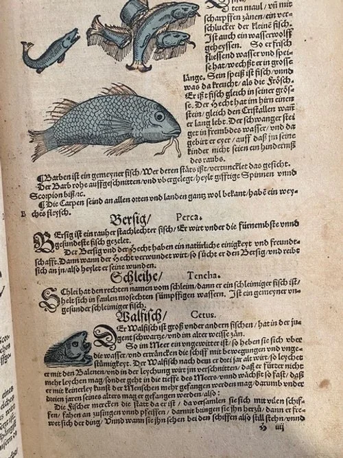 Figure 7: Adam Lonicer’s depiction and classification of the “Walfisch” (Cetus) under the category of fish in the Kreuterbuch. Held in the collection at the Kinney Center for Interdisciplinary Renaissance Studies.